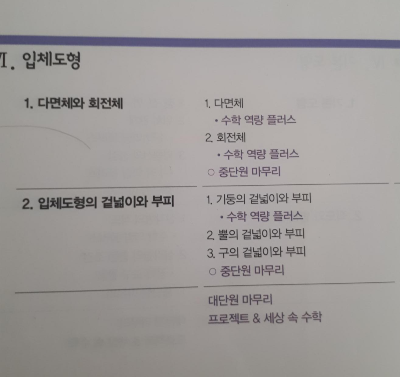 6단원은 다면체와 회전체, 입체도형의 겉넓이와 부피 단원이다.